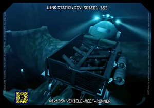 Reef Runner is a mini-submersible operated by Bobby of Ocean Floor Mining Corporation in 2017 CE. It features a truck bed aft-ward with interlocking bars to secure goods during transit.